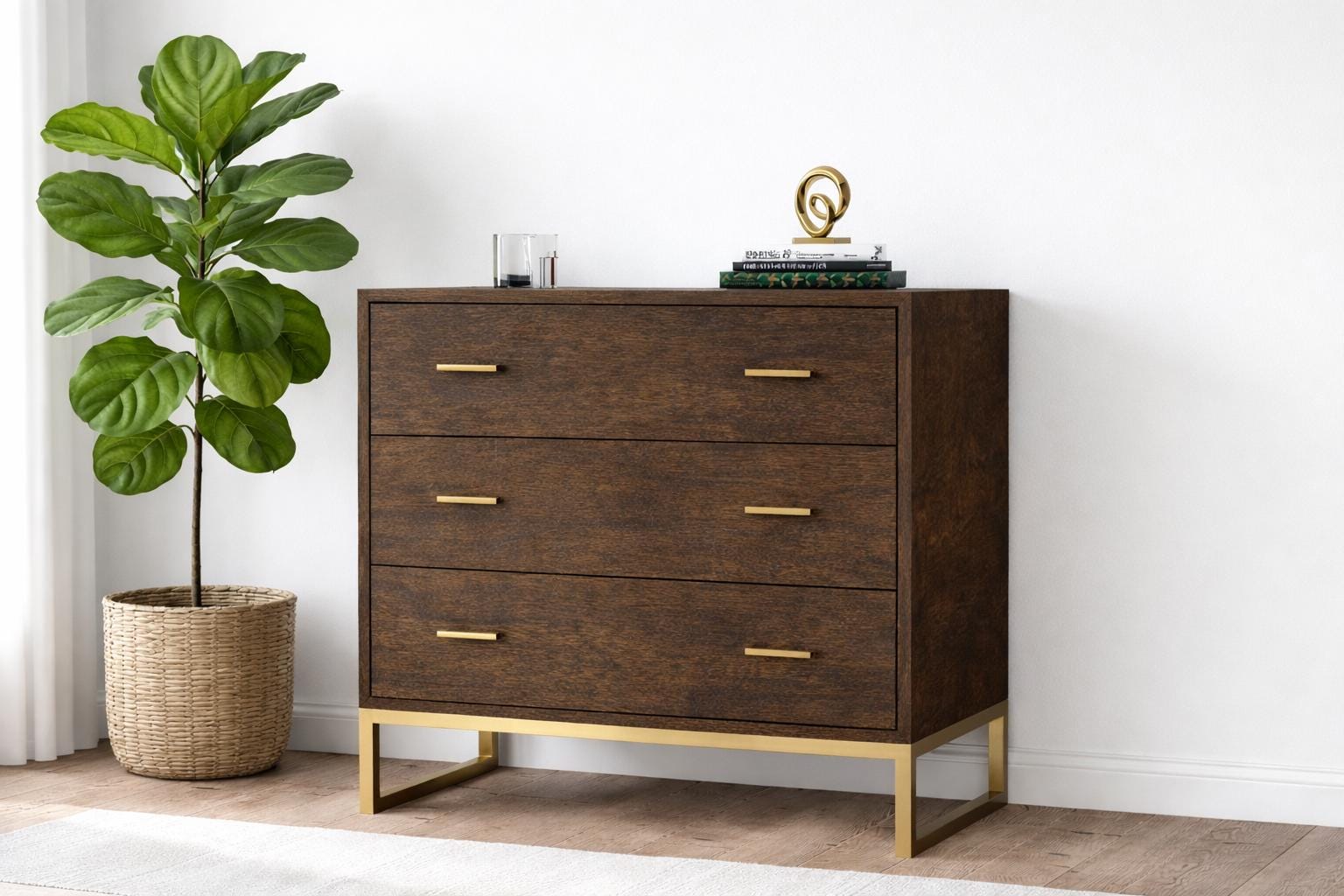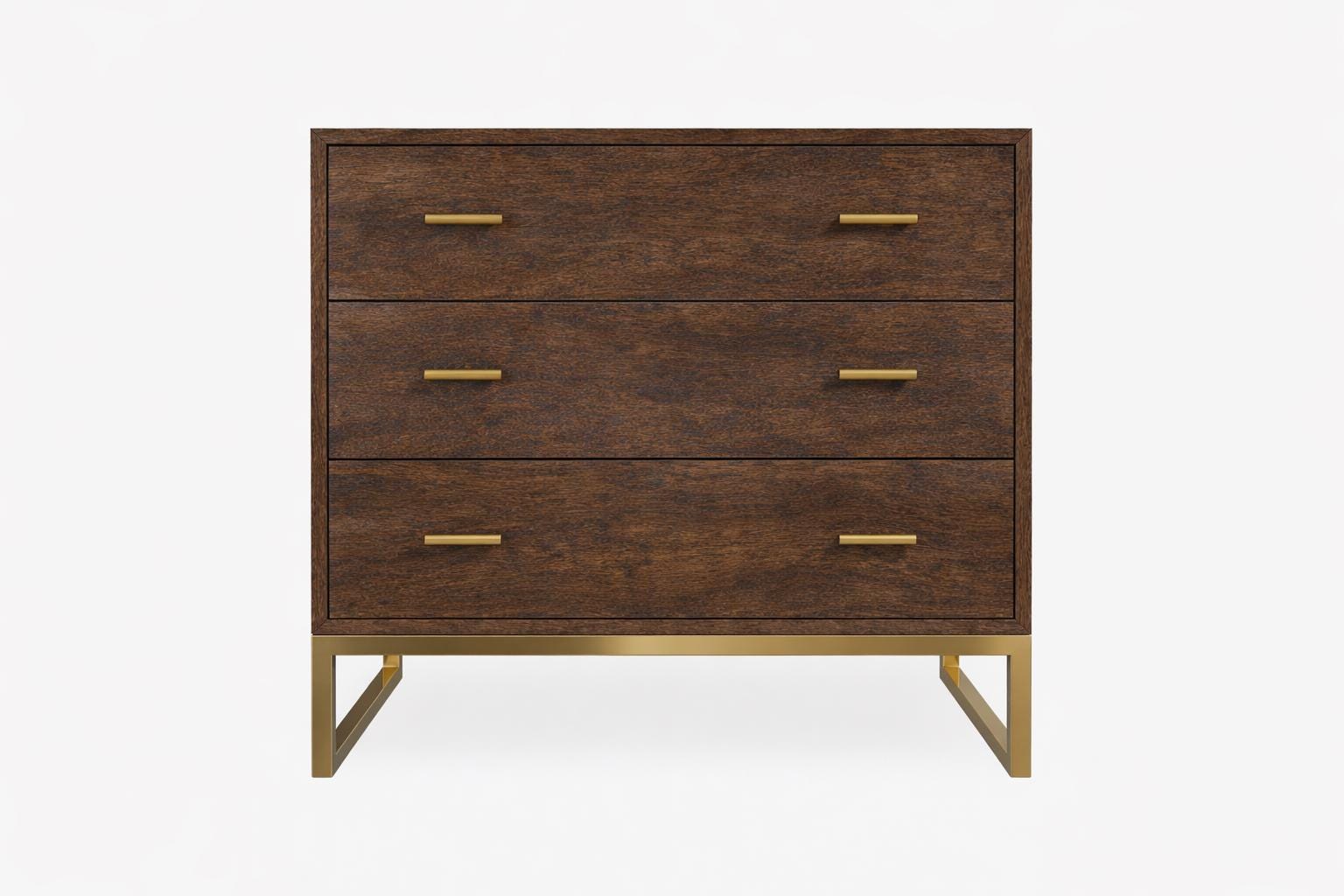 A handcrafted statement piece that blends classic elegance with an industrial edge. The Aubrey chest features a rich walnut-stained finish that brings warmth and depth to your bedroom, while the contrasting gold base and handles add a refined, contemporary touch.