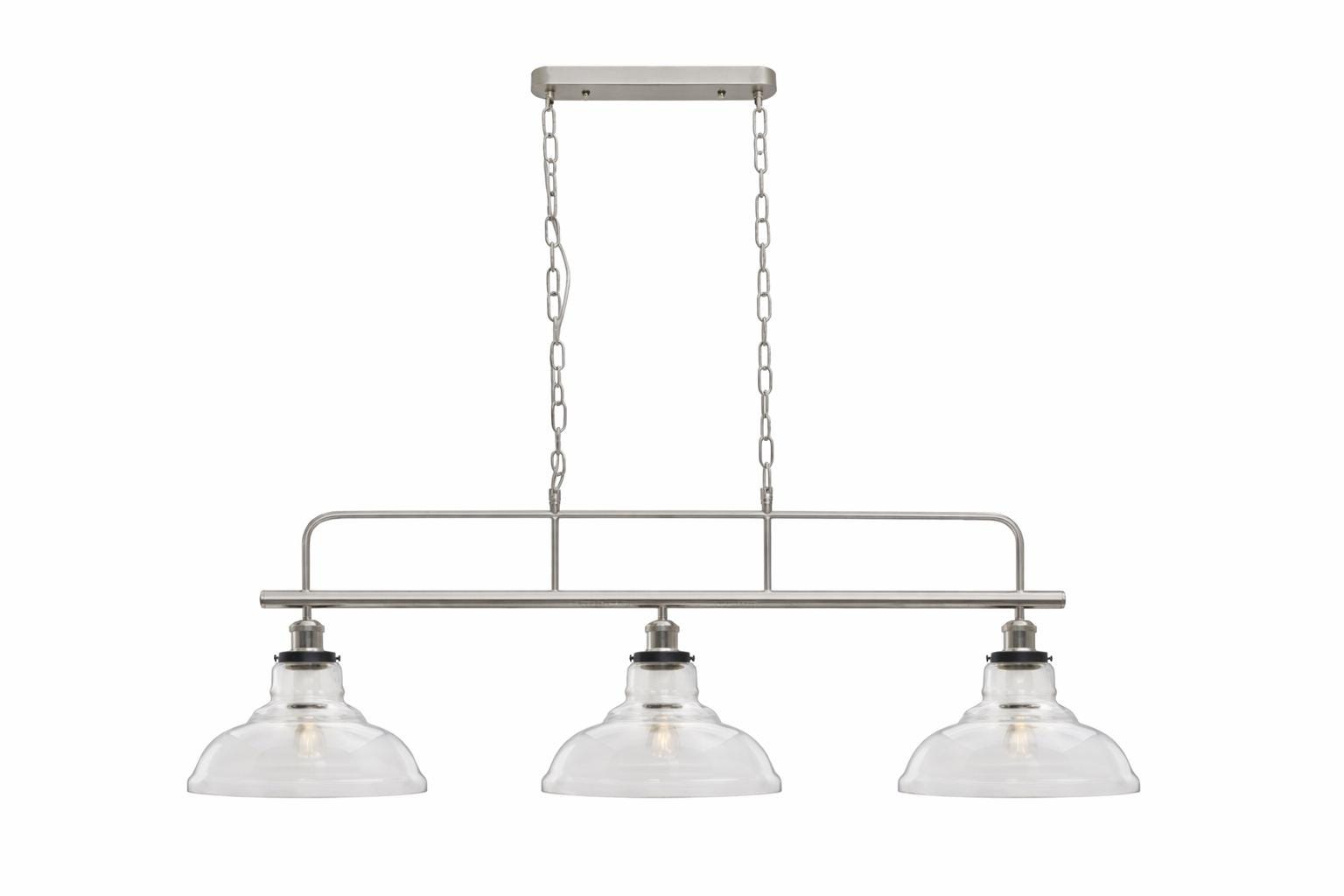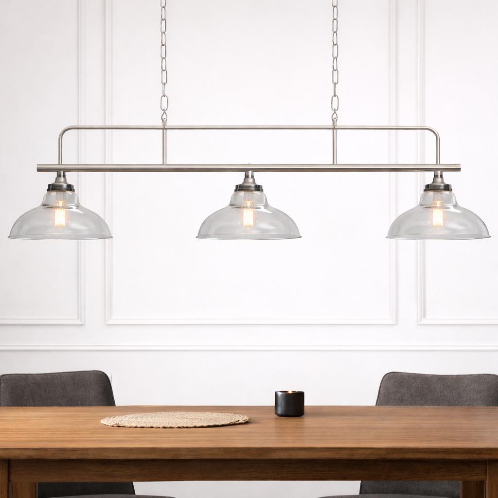 A striking ceiling feature that blends modern styling with subtle industrial character. Suspended from an adjustable chain, this three-light bar pendant showcases clear glass dome shades set within a brushed chrome frame for a clean, contemporary finish.